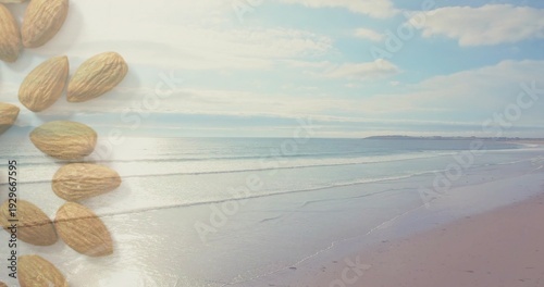 Fototapeta premium Reflecting wet sand and shallow waves on coastal seascape at low tide, featuring shelled almonds