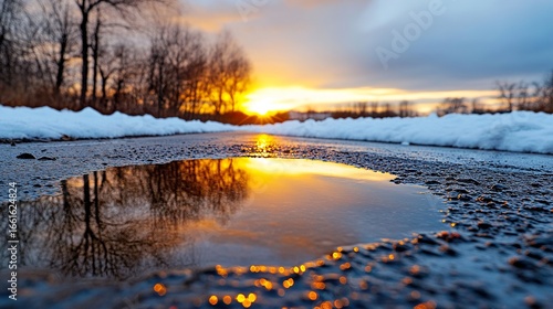© yurik art, Fototapeta premium Reflection in sunset puddle. Close-up of the reflection in a puddle on an asphalt road at sunset.