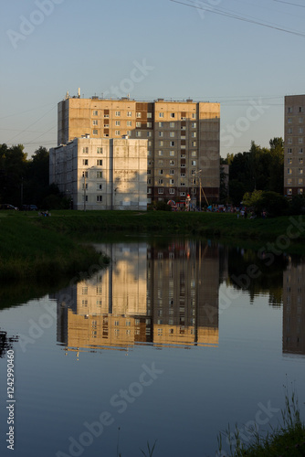 © Elanur, Fototapeta premium Reflection of a multi-storey building from water