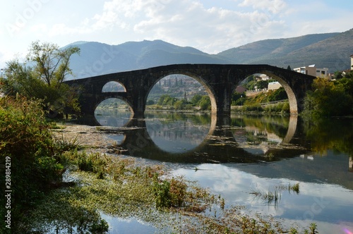 © oljasimovic, Fototapeta premium reflection of a stone bridge in a river
