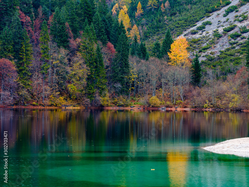 Fototapeta premium Reflection of autumn foliage along the shore of Lake Tovel, Trentino Alto Adige