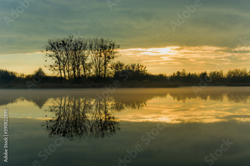 © darekb22, Fototapeta premium Reflection of evening clouds and trees in a misty lake