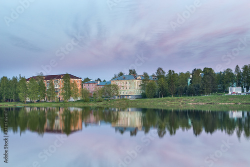 © Андрей Старцев, Fototapeta premium reflection of houses in a pond at sunset