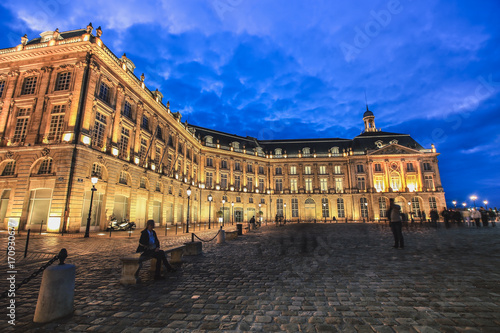 Fototapeta premium Reflection of Place De La Bourse and tramway in Bordeaux, France. A Unesco...