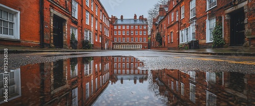 © DIAHIMAGESNEW, Obraz premium Reflection of red brick buildings in a rain puddle on a street.