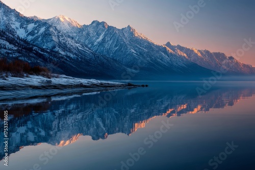 Fototapeta premium Reflection of snowy mountains in calm lake at sunrise
