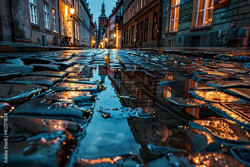 Obraz premium Reflection of the old city street with traditional european architecture in the puddle after rain