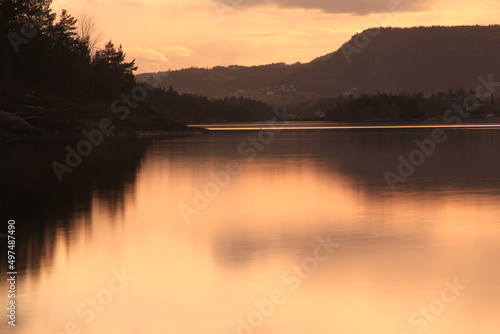 Fototapeta premium reflection of the sky and mountains in the water - Fornebu