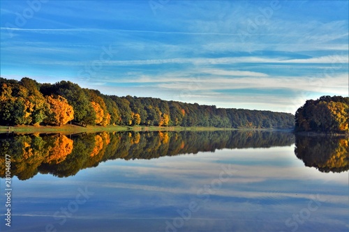 © sebi_2569, Fototapeta premium reflection of the yellowed forest in the water of the lake