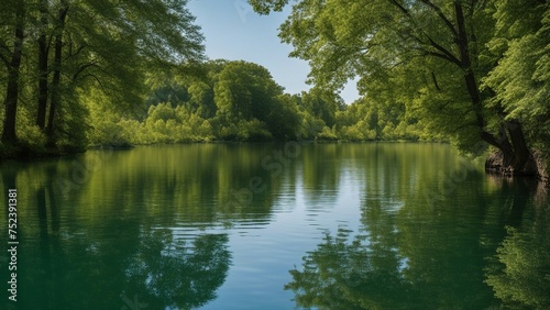 Fototapeta premium reflection of trees in the water A serene lake with gentle ripples on the surface. The water is clear and reflects the blue sky