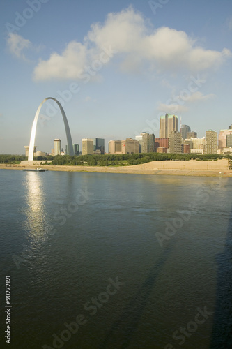 © spiritofamerica, Naklejka premium Reflection on Gateway Arch ("Gateway to the West") and skyline of St. Louis, Missouri at sunrise from East St. Louis, Illinois on the Mississippi River