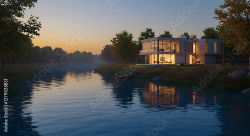 © egavirgian art, Obraz premium Reflections at Dusk: A 3D Visualization of a Modern Riverside Home