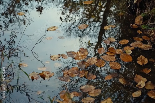 © Mykhailo Podolian, Obraz premium Reflections of autumn leaves drifting on a tranquil pond surrounded by trees