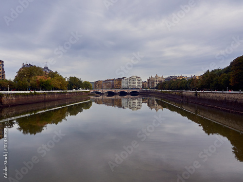 © Daniel, Obraz premium Reflections of buildings on the Bilbao estuary