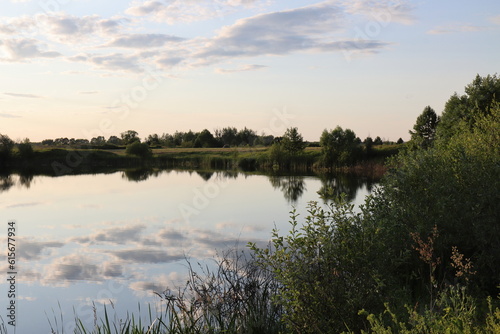Fototapeta premium Reflections of clouds and trees in the mirror of the water of the lake