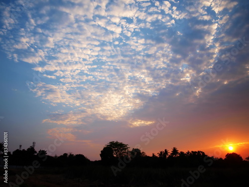 Fototapeta premium Reflections of clouds white sunset and silhouette of trees below the mountain. Selective focus.