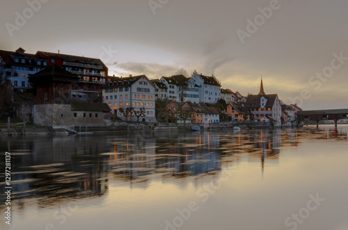 © bersch28, Naklejka premium Reflections of historic buildings along the calm river at sunset in a tranquil town