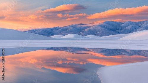Fototapeta premium Reflections of orange and pink sunset clouds in the still water on white sand