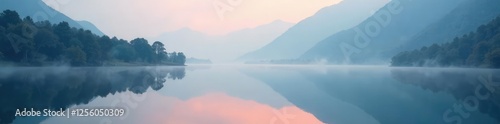 © Sourithideth, Fototapeta premium Reflections on the calm surface of Yamdrok Lake, landscape, fog, mist