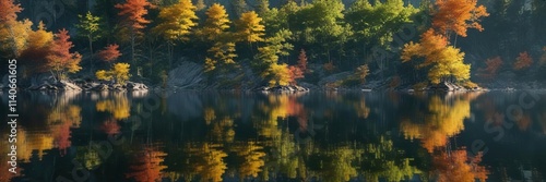 Fototapeta premium Reflections on the lake's surface with surrounding foliage, peaceful,...