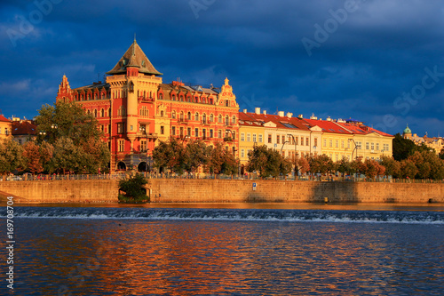 Obraz premium Reflections on the Vltava river at sunset in Prague city center
