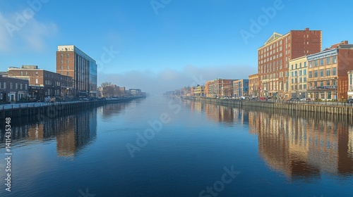 © AsterionMad, Obraz premium Reflective City River on a Misty Winter Morning
