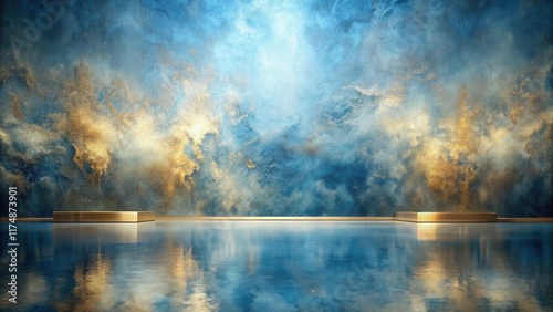 Obraz premium Reflective Floor with Golden Platforms and a Blue and Gold Abstract Wall