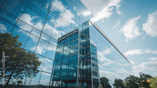 Fototapeta premium Reflective Glass Building Against Blue Sky and Clouds