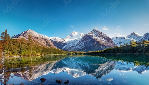 © sailor, Naklejka premium Reflective Lake with Mountains