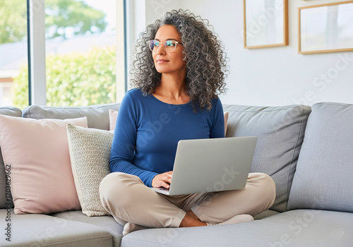 © InfinityVisuals, Naklejka premium Reflective Moments of Inspiration: A woman, laptop in lap, sits thoughtfully on a sofa, bathed in natural light, capturing a moment of calm and inspiration while working remotely.