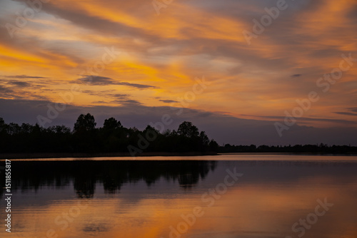© K, Fototapeta premium Reflective surface beautiful orange and pink sky background reflective look in large lake in Latvia near city Saldus, water sunset reflection on water surface