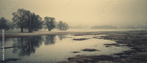 © Ai Studio, Fototapeta premium Reflective water under a grey, fog-laden sky creates a serene, expansive landscape, with sparse trees enhancing the peaceful solitude.