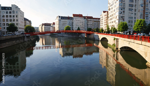 © SolarisKG, Obraz premium Reflets sur la rivière dans la ville au pont rouge