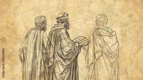 © T Studio, Fototapeta premium Reform and Discovery in 2 Kings 22: Josiah, Book of Law - Biblical Illustration on Beige Background with Copyspace for Faith-Based Themes