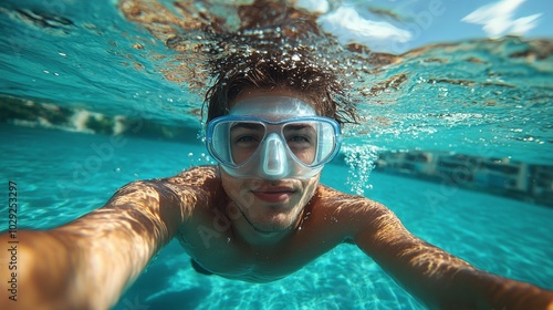 © Pravinrus, Fototapeta premium Refreshing at pool. Underwater wide angle selfie shot