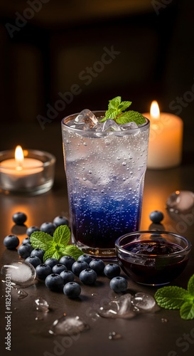 Obraz premium Refreshing Blueberry Mint Drink with Ice and Candlelight