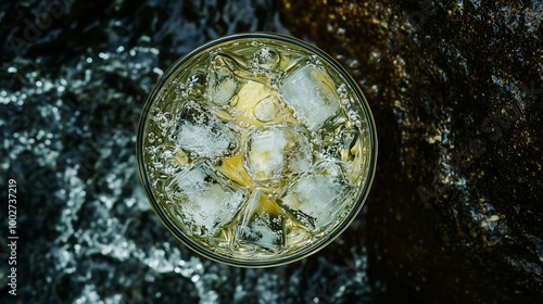 Obraz premium Refreshing drink with ice cubes sits on a rocky surface near flowing water on...