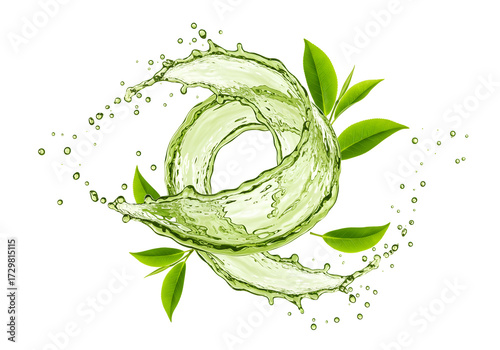 Fototapeta premium Refreshing green liquid splash with vibrant green leaves, symbolizing natural vitality and healthy hydration, isolated on a clean white background.