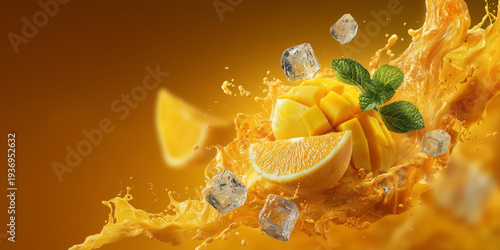 Naklejka premium Refreshing mango-orange juice explosion with realistic cubes, dramatic water splash and floating ice, ideal for summer menu or promo banners