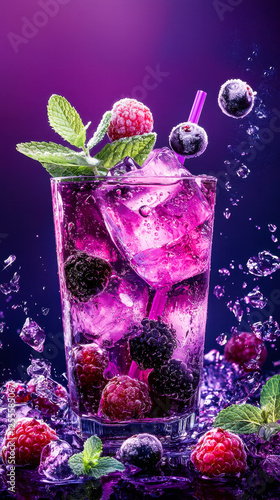 Fototapeta premium Refreshing mixed berry cocktail with ice cubes and mint against purple...