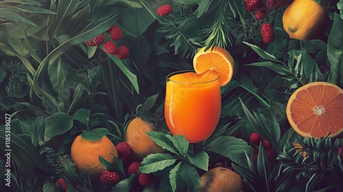 © Infinity, Obraz premium Refreshing Orange Juice in Lush Tropical Setting