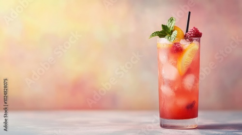 © 96, Naklejka premium Refreshing summer cocktail with fruits, leaving space for copy in the background