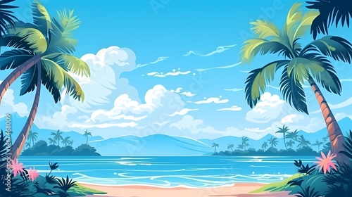 © Sunny, Obraz premium Refreshing Summer Ocean View with Palm Trees, Relaxing Beach Background