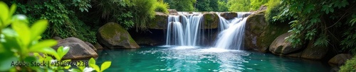 © yuwaree, Fototapeta premium Refreshing waterfall cascading down mossy rocks into a pristine summer pool, surrounded by lush green foliage under bright sunlight , rocks, refreshing, travel