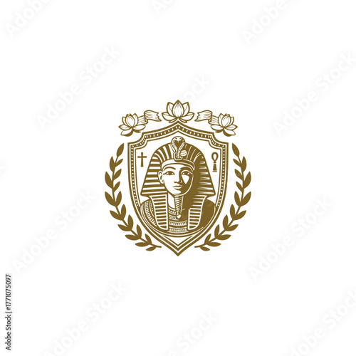 Fototapeta premium Regal and stylized illustration of an Egyptian Pharaoh's mask (possibly Tutankhamun) centered on a shield, framed by a laurel wreath, sacred lotus flowers, and Egyptian symbols