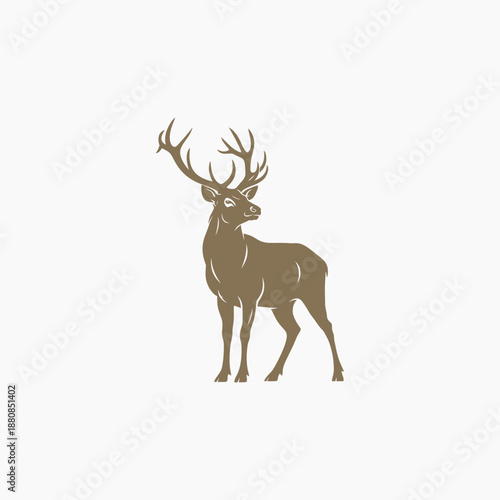 © Rizquna_art, Obraz premium Regal Brown Stag Silhouette with Large Branched Antlers On White Background. Vector Logo Design.