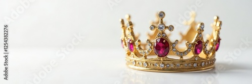 © Sourithideth, Obraz premium Regal crown adorned with sparkling gemstones on a pristine white background, glitter, golden, opulence