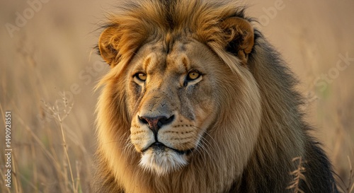 © alisya, Obraz premium Regal lion contemplates in savanna grasses