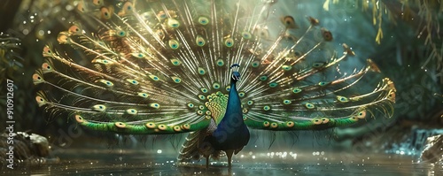 Naklejka premium Regal peacock displaying its vibrant plumage, 4K hyperrealistic photo