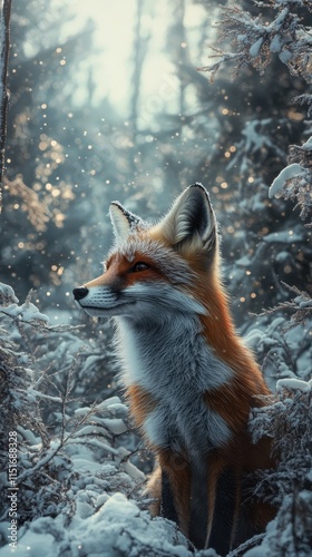 Obraz premium Regal red fox in a snowy forest illuminated by golden light and surrounded by...